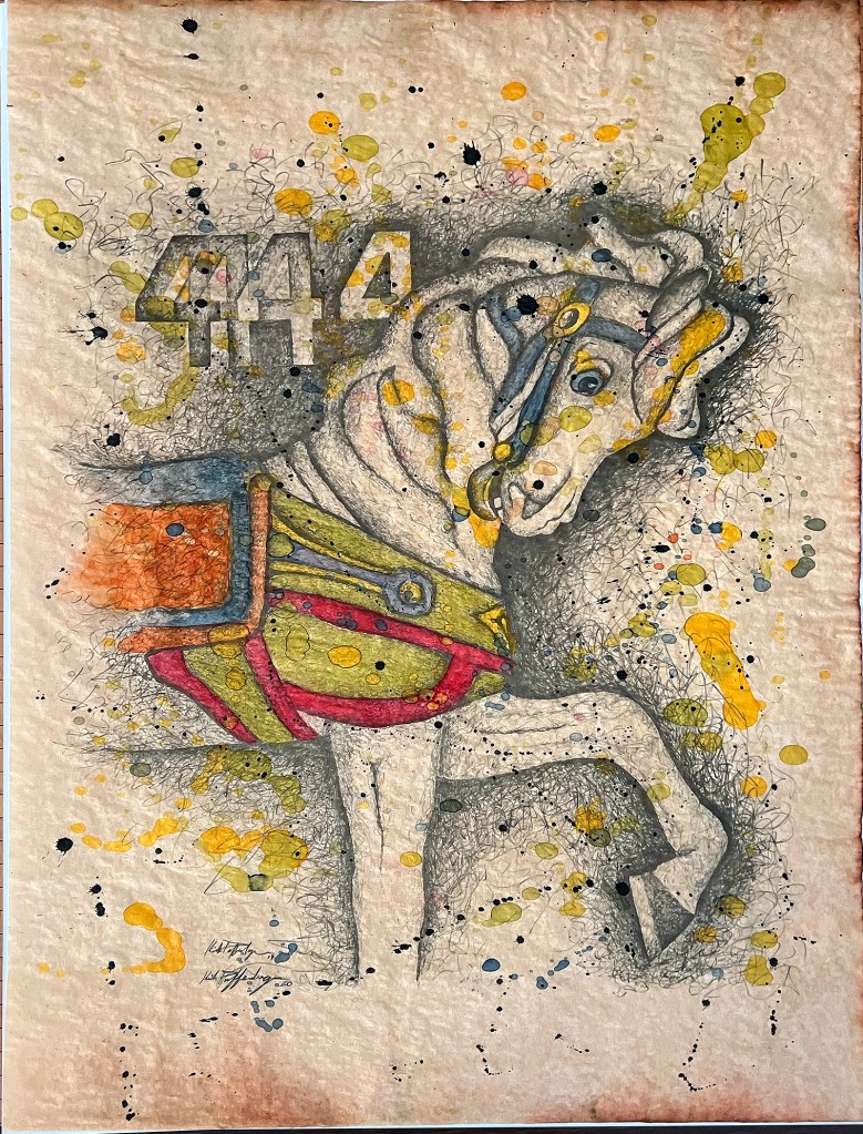 Embellished Print of my original Carousel Pony drawing. Hand-painted with alcohol inks on Gettysburg Parchment, for an elegant look and feel. Each is a one-of-a-kind. 18″x24″ $180.