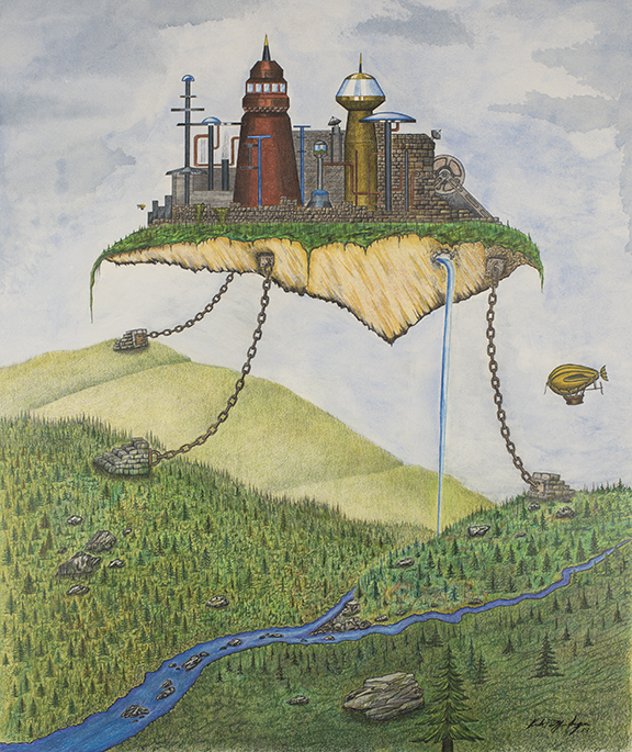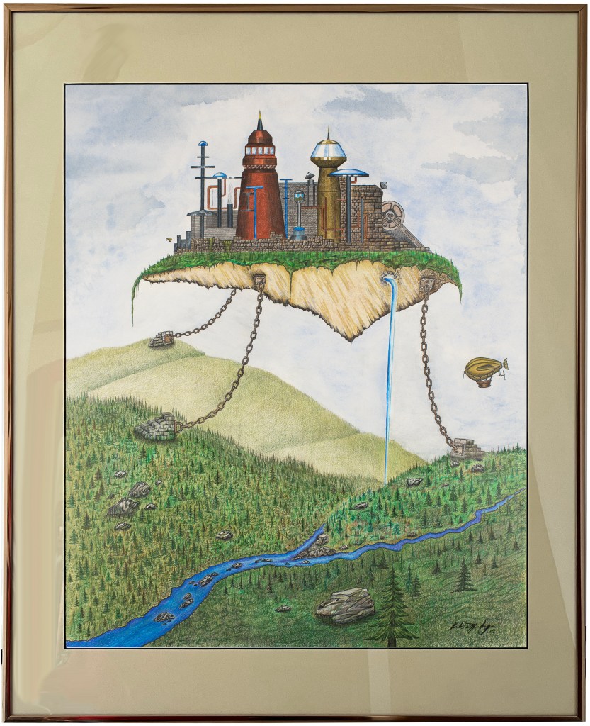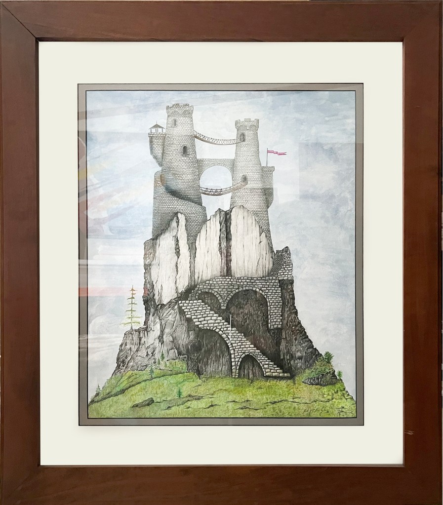 Floating Citadel – original color pencil drawing, 23×30″ matted and framed in gold tone aluminum frame. $800.00