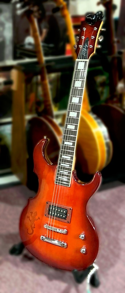 Custom Built Electric Guitar – single Dimarzio ToneZone Dp155 pickup, body is made with exotic Jelutong wood. 35 coats of NiC Lacquer finish, comes with Crossrock case. $4,000