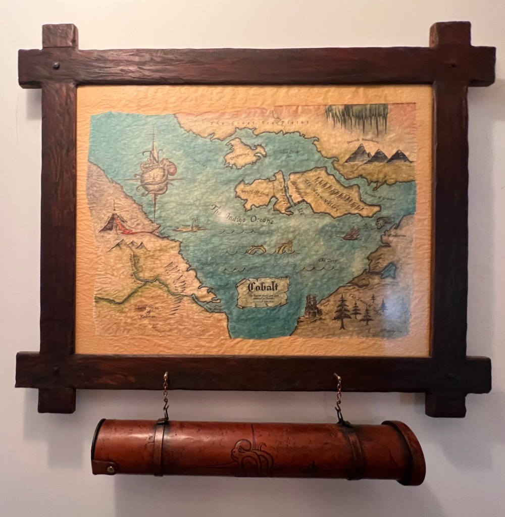 Framed Map Illustration of Cobault. My original 30×23″ illustration done on Gettysburg Parchment. In a custom frame made of locally grown cherry. This piece was made to incorporate the leather map carrier, but can be sold separately. Framed Map Illustration $650. Sold together – $1,000.