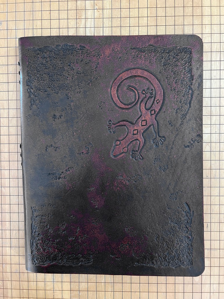 LEATHER LIZARD – hand-tooled leather. 10″x12.5″ with 64 pages of Gettysburg Parchment. $125.